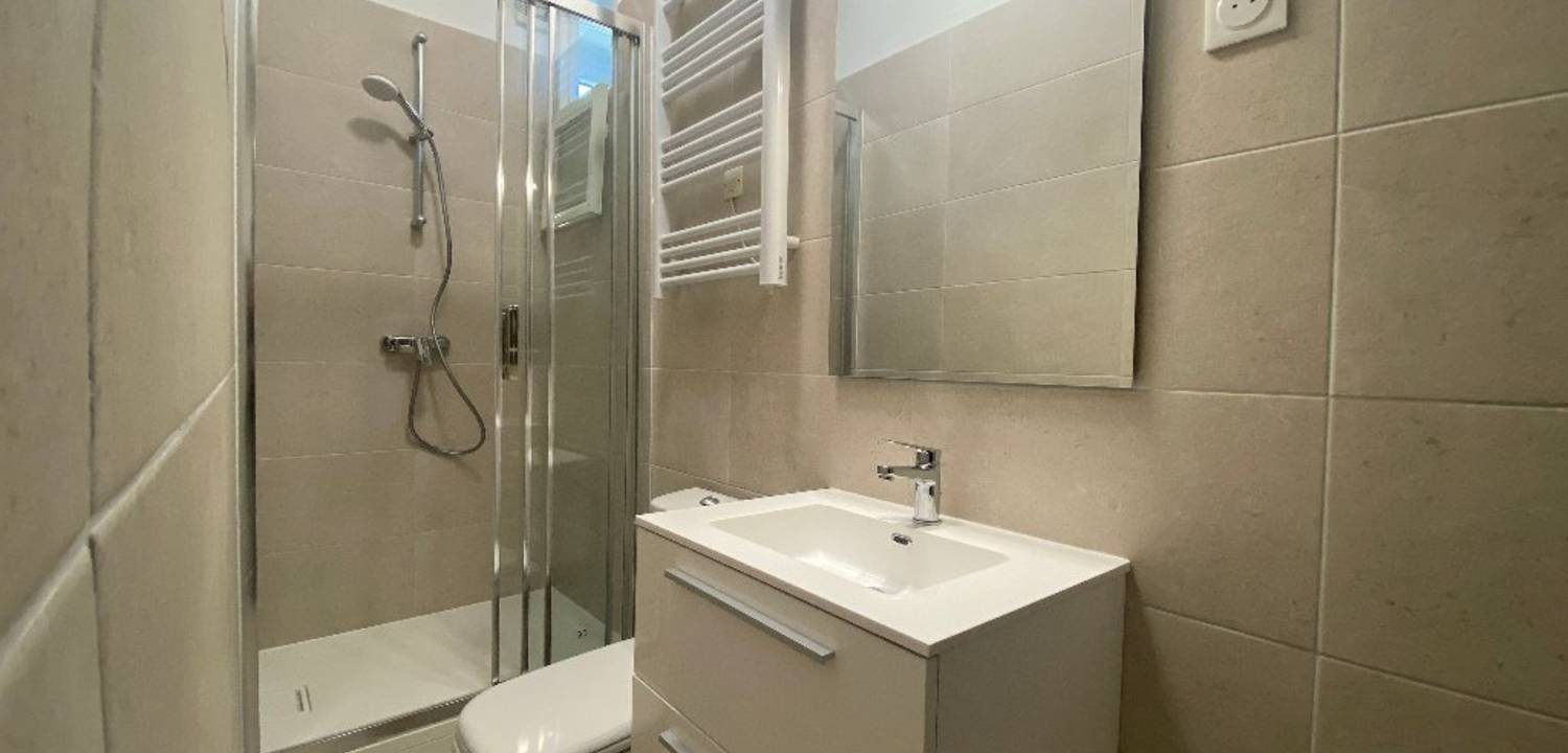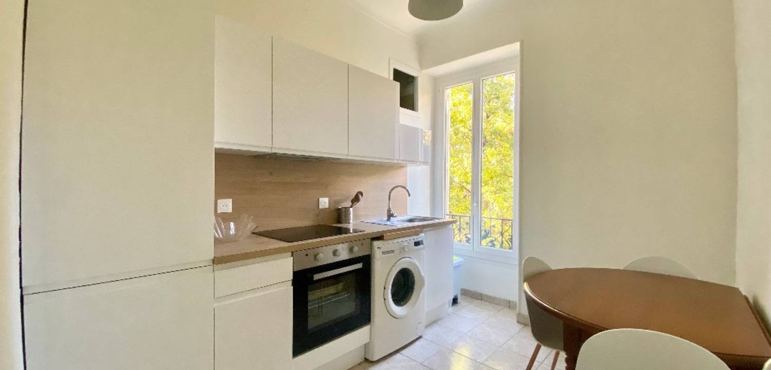 Pièce à vivre avec convertible neuf 2 places, cuisine séparée équipée de plaques, frigo et congélateur, machine à laver le linge et four. Salle d'eau WC. Chauffage et eau chaude individuel. Bus et commerces. Proche Bd Joseph Garnier. Visite virtuelle visible sur notre site internet. Disponible de suite. contact Gwenaelle 06.30.72.00.25.