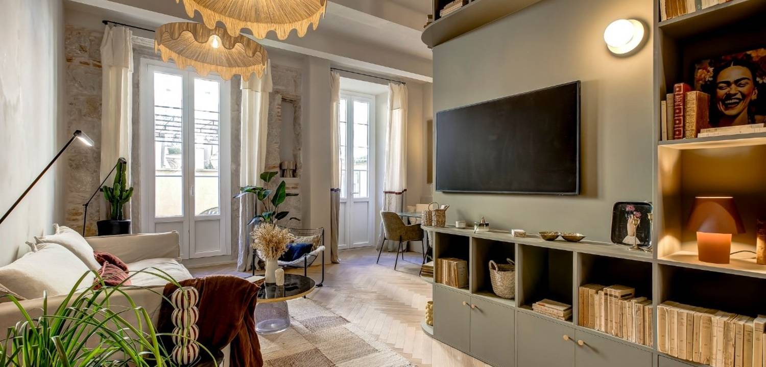 La rénovation a su préserver les éléments d'origine tels que la pierre, les poutres et la belle hauteur sous plafond. Le séjour s'ouvre sur une terrasse de plus de 50 m² donnant sur cour, offrant un espace extérieur appréciable et au calme. L'appartement comprend trois chambres, deux salles de bains, des toilettes invités ainsi qu'une buanderie, avec une distribution fonctionnelle adaptée à une vie de famille. Un bien rare par sa surface extérieure et son emplacement central.